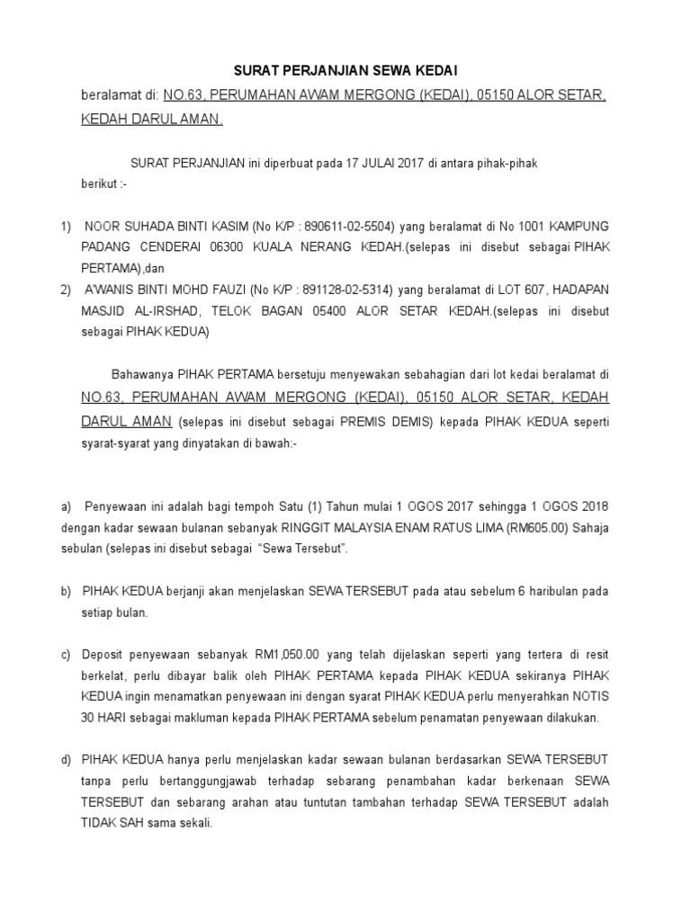 Surat Perjanjian Sewa Kedai Edited Pdf